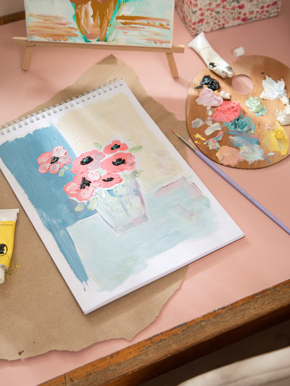 Clara gently flips through the pages of the oil painting pad. "Such a fine surface for your artistic endeavours, dear Anna," she says. Anna's eyes light up with inspiration. "Indeed, each sheet awaits a masterpiece, ready to capture vibrant colours and bold strokes."