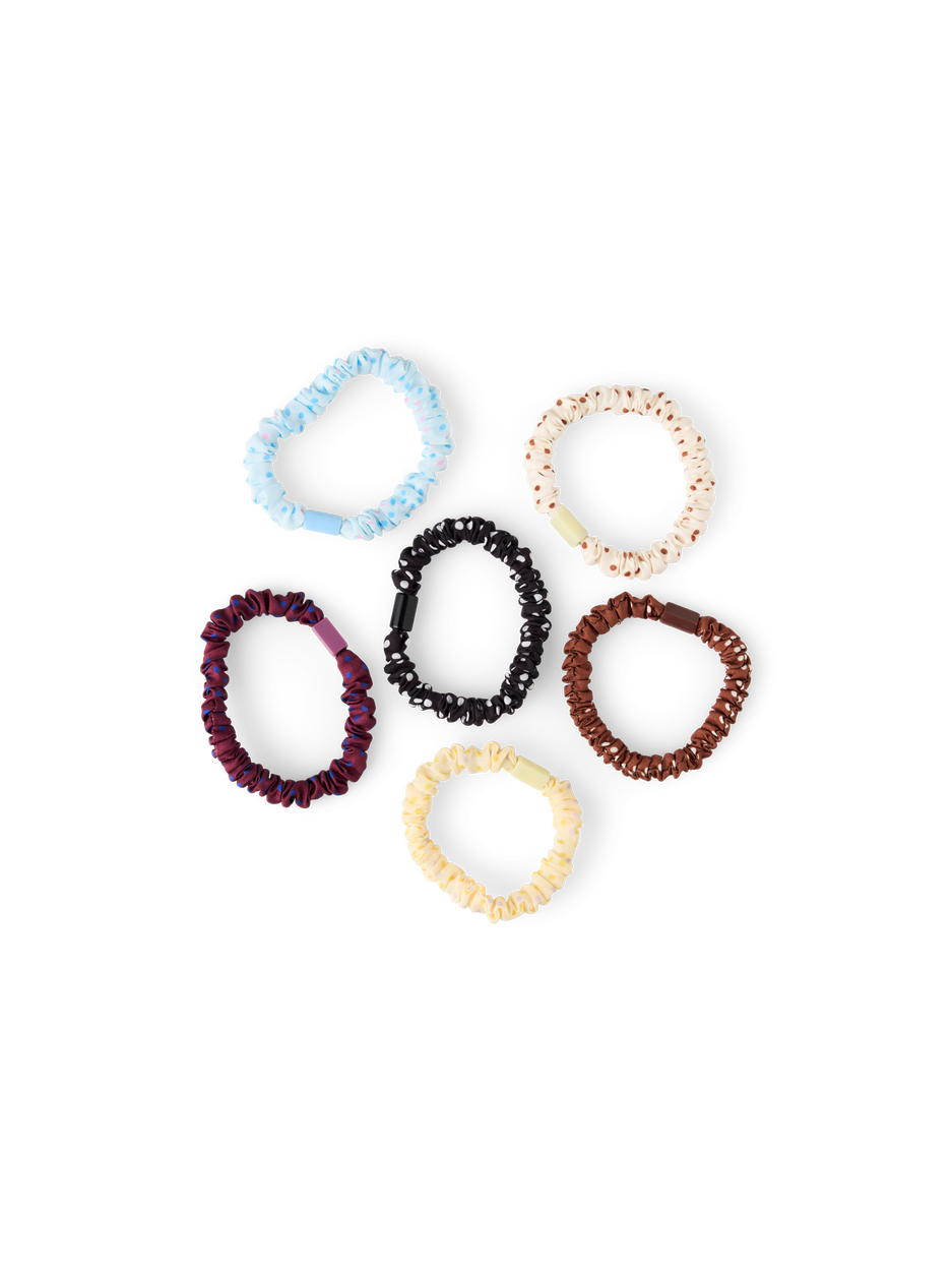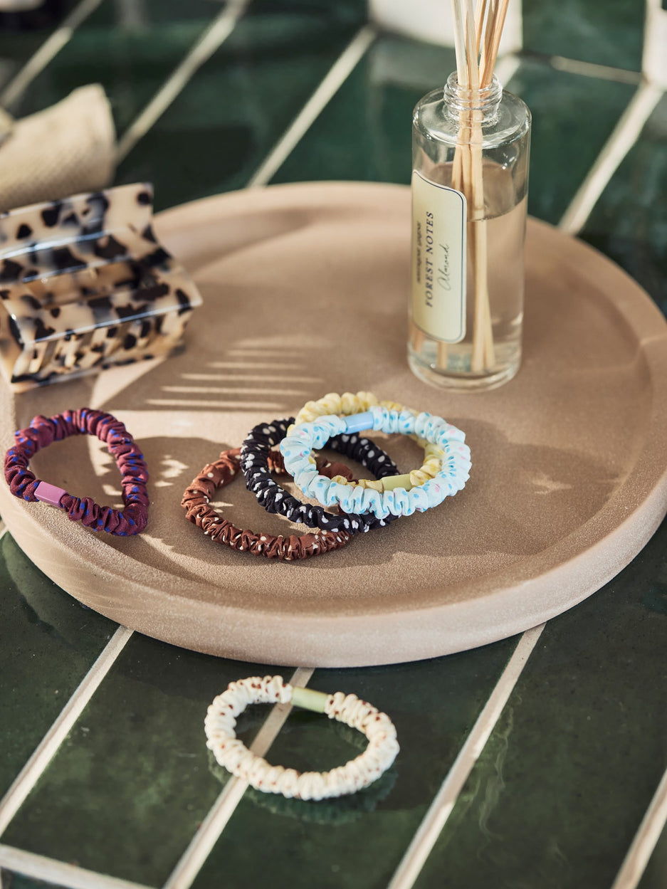 Clara arranges the mini scrunchies neatly in a little dish on her dressing table. "Such a practical way to keep hair tidy throughout the day," she adds. Anna exclaims, "And so delightful to add a dash of colour to any hairstyle!"