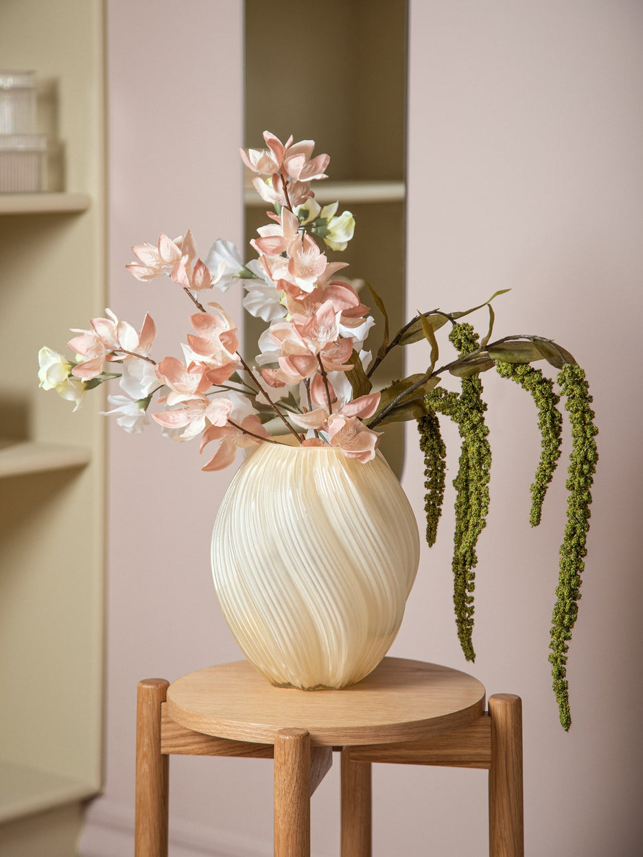 "Flowers bring a sense of joy and beauty into the home," Clara remarks, gently placing a bouquet in the vase. Anna smiles, admiring the vase's textured, wavy design. "A lovely piece that adds charm to any room," she says.