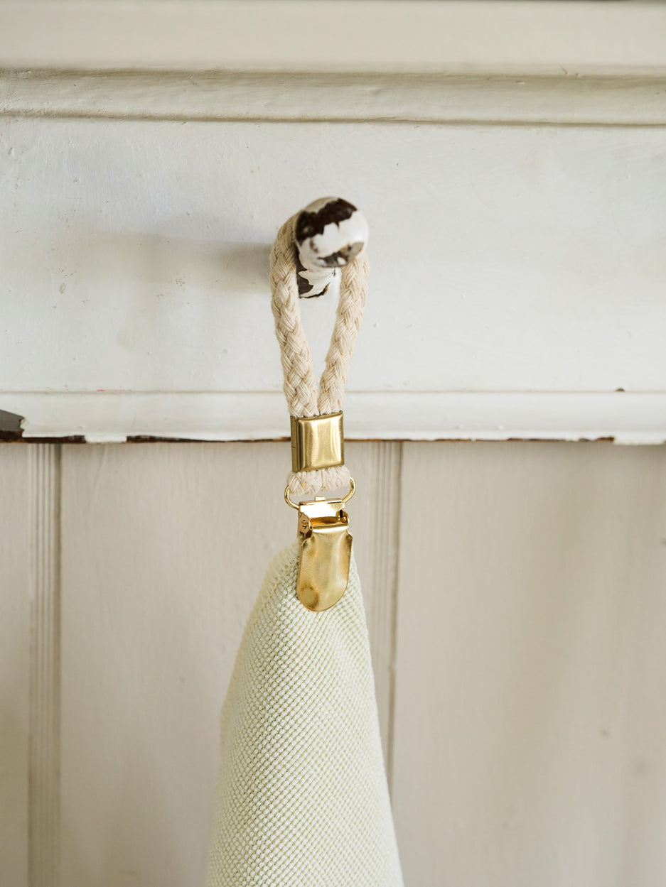 "Keeping things tidy is essential," Clara says, adjusting the small clip in the kitchen. "As such, organising tea towels and cloths become a breeze."