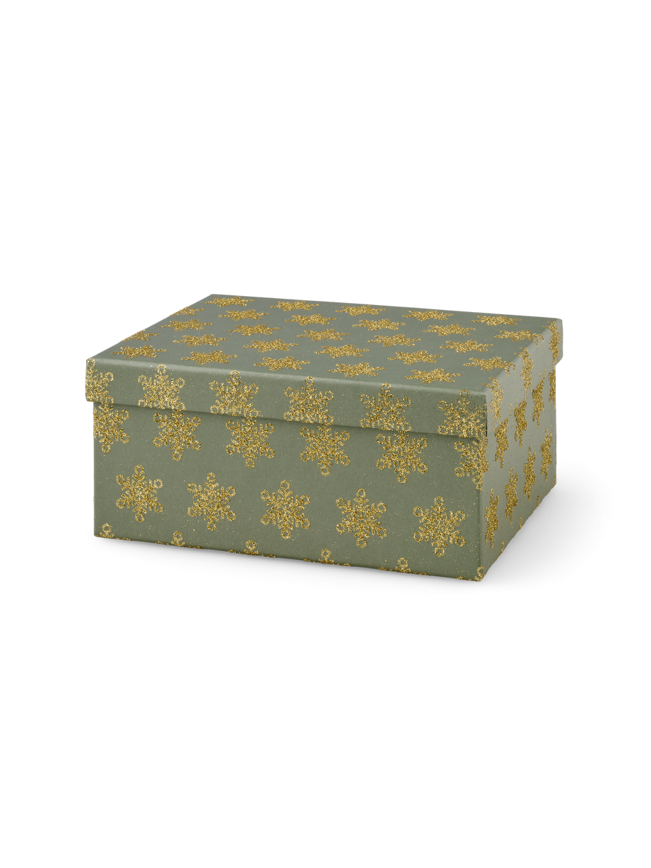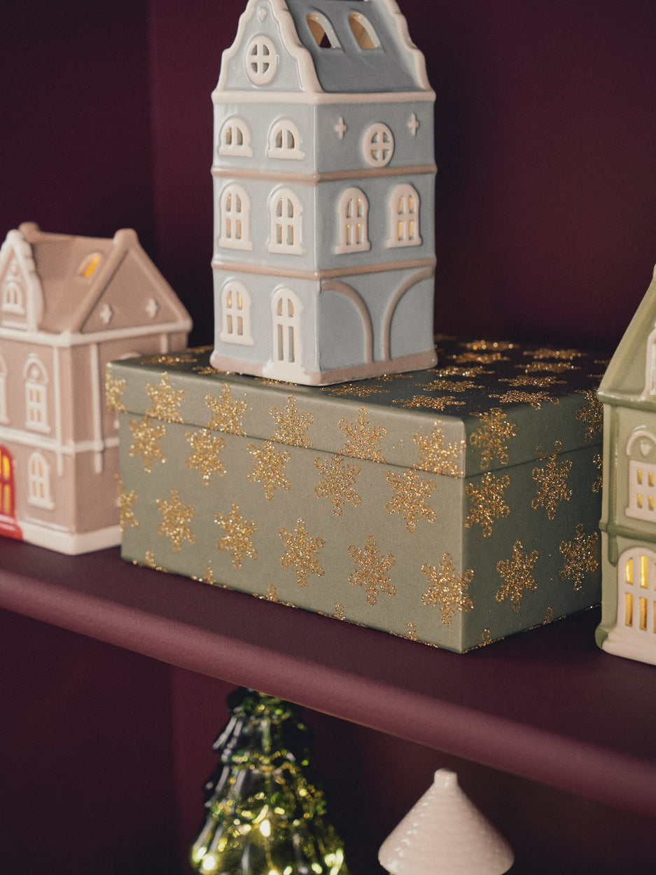 A gift box sits elegantly on the table, its delightful pattern catching the light. "Such a lovely way to present a gift," Clara says as she passes by. "I wonder who the lucky recipient is..."