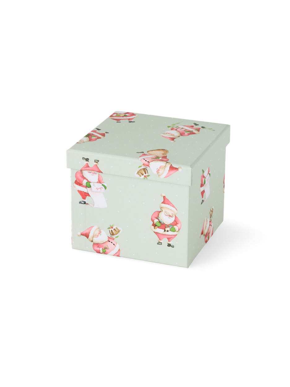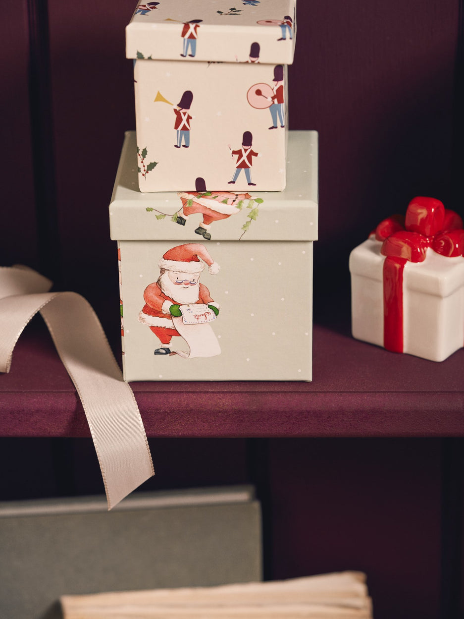 Clara gently places a festive box with a lid on the table. "A delightful way to present a gift," she says. Anna adds, "It transforms any present into a charming surprise, perfect for the holiday season's joy and warmth."