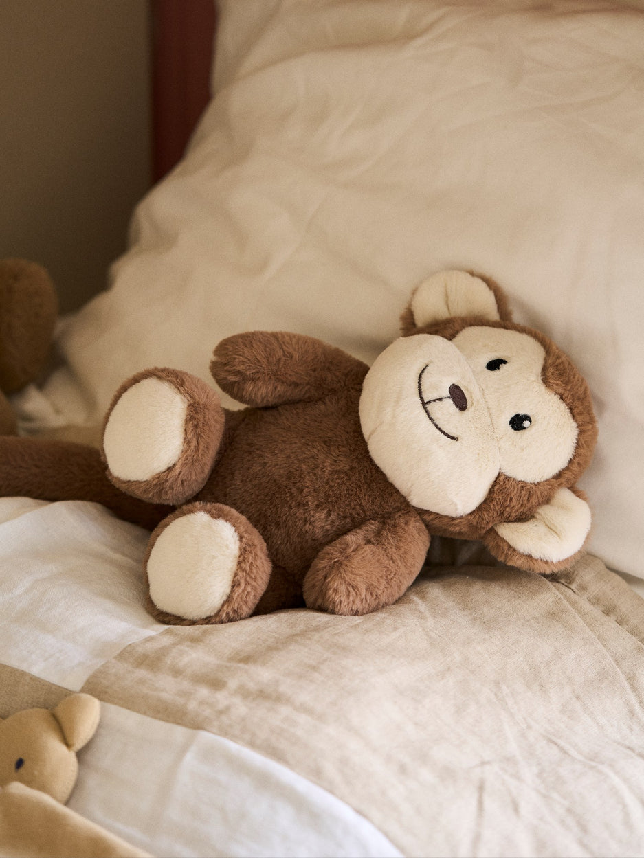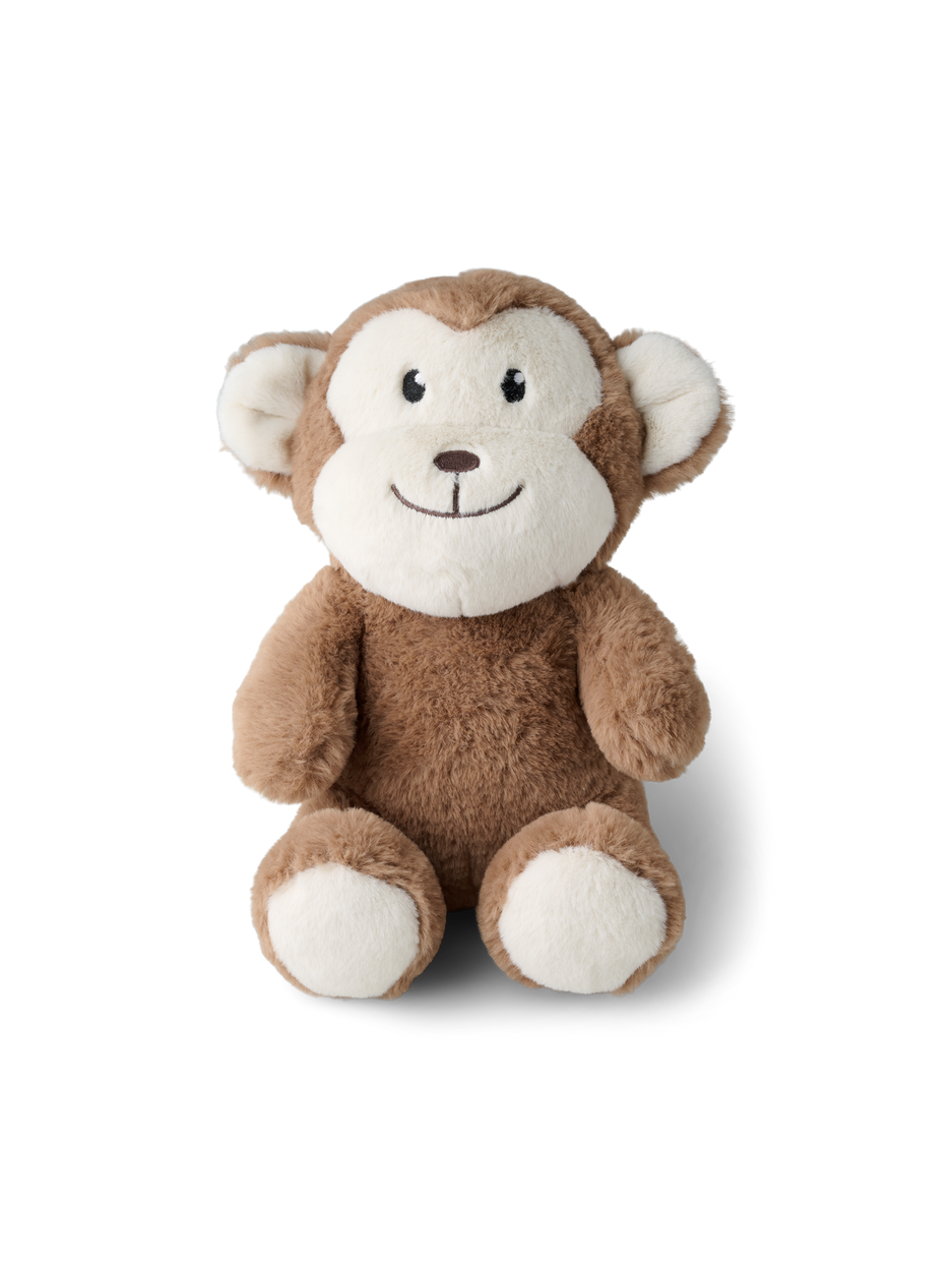 Anna gently places the soft monkey teddy in the arms of her nephew. "This cuddly friend will surely bring you endless joy," she says. Clara adds, "A delightful companion for playtime and cosy naps."