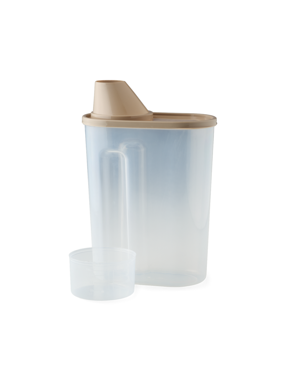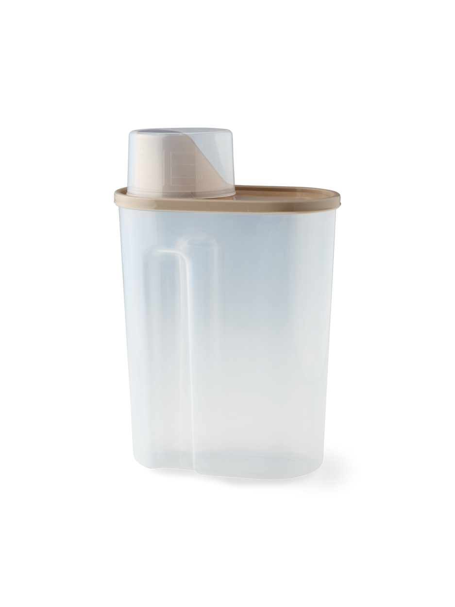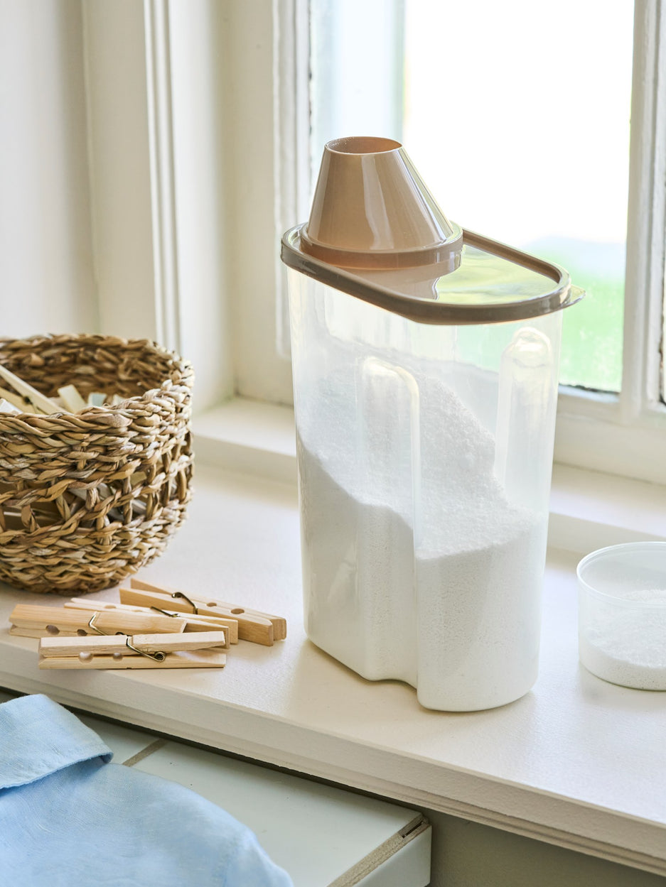 Clara carefully pours detergent into the storage container. "This keeps everything tidy and within reach," she says. "And the measuring cup ensures just the right amount each time."