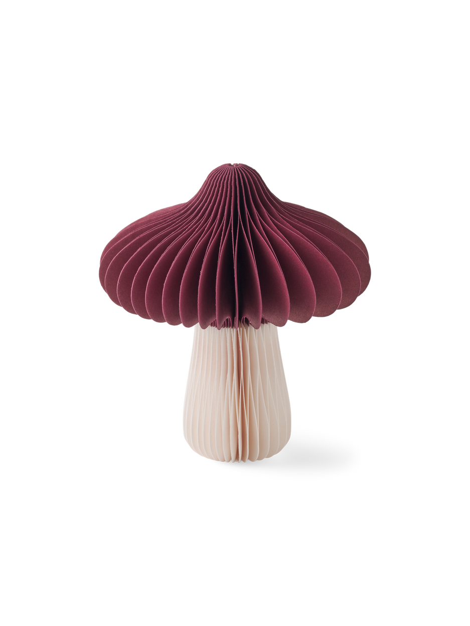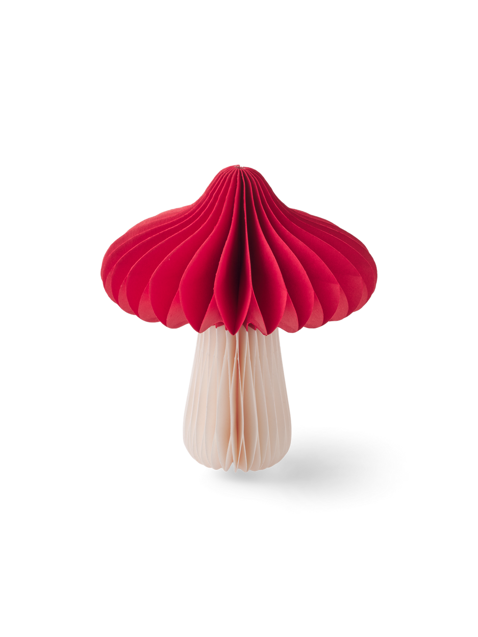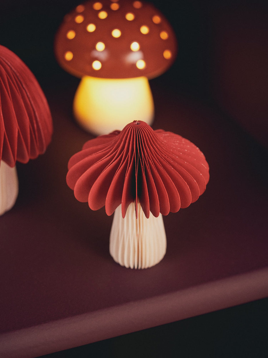 Clara smiles as she places the paper mushroom on the shelf. "Such a whimsical touch to our décor," she says. Anna nods, adding, "Its charming design brings a playful spirit to any room."