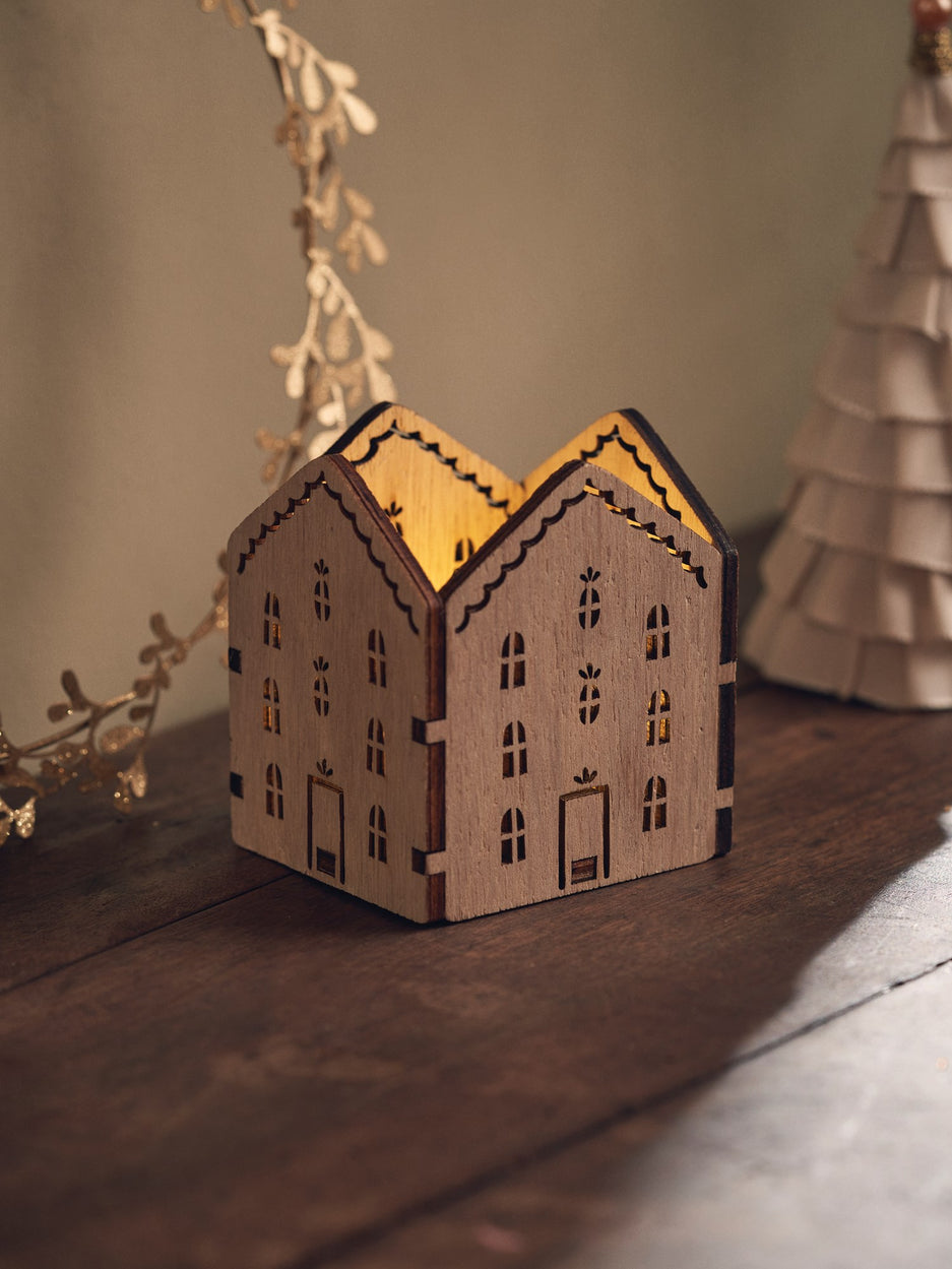 Clara places the LED house on the mantelpiece, saying, "Its gentle glow brings a cosy atmosphere to any room." Anna continues, "The charming design adds a whimsical touch, perfect for creating a warm and inviting home."