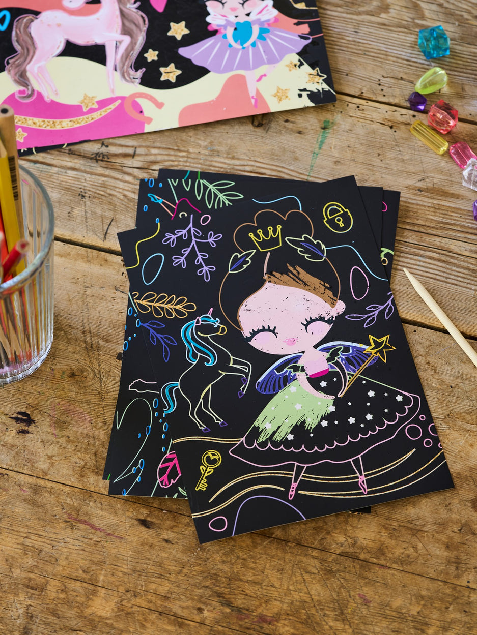 "These scratch cards are a delightful way to spark creativity," Clara says, watching the nephew reveal shimmering princess designs. Anna smiles, "A magical adventure with every scratch, perfect for an afternoon of imagination."