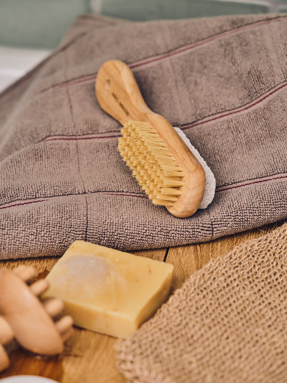 "Enhancing our skincare routine is always delightful," Clara notes as she gently uses the foot brush. "A wonderful tool for self-care," Anna observes, appreciating its role in pampering their feet after a long day.
