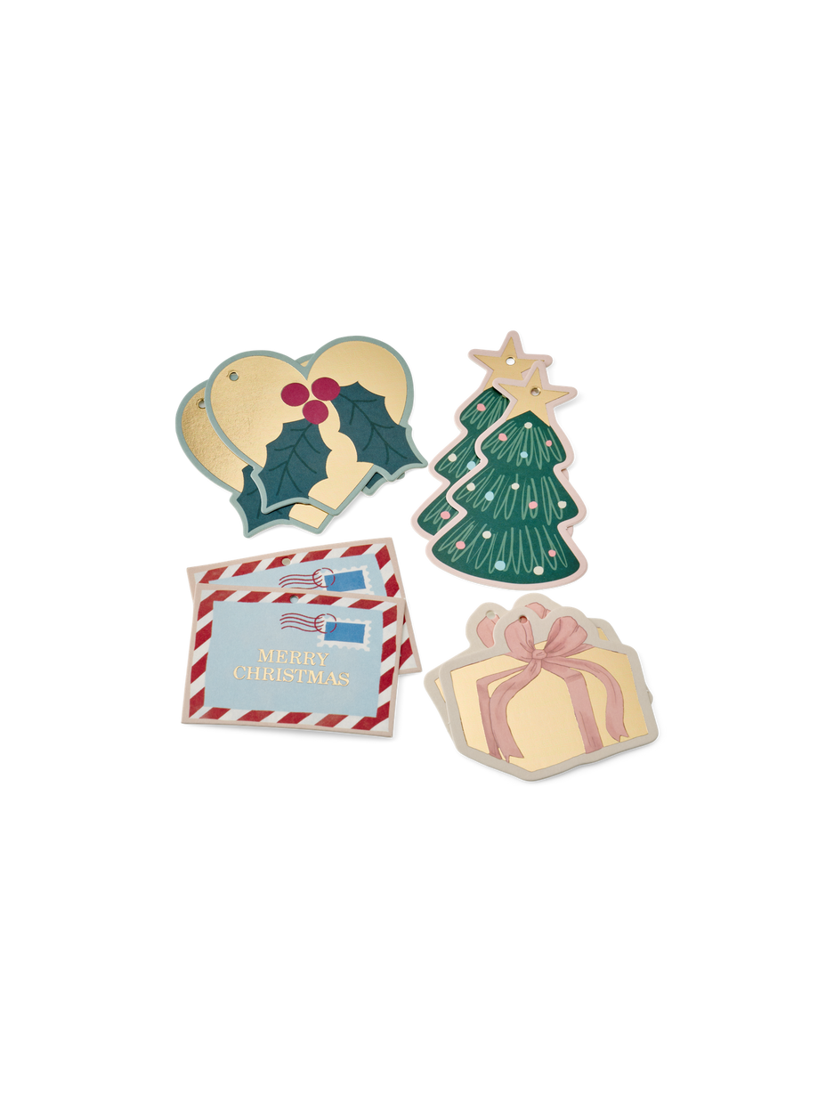 "These charming Christmas gift tags add a personal touch to your presents," Clara says, admiring the festive designs. Anna smiles, "They bring warmth and joy to each carefully wrapped gift, making the season even more special."