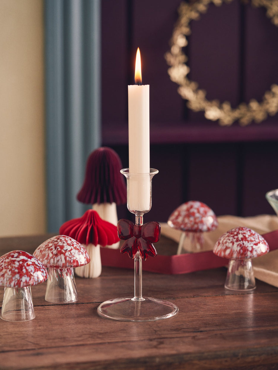"Lighting candles always brings a sense of warmth and charm to our home," Clara says, gently placing a candle in the holder. Anna adds, "The delightful design with a bow adds a festive touch to any setting."