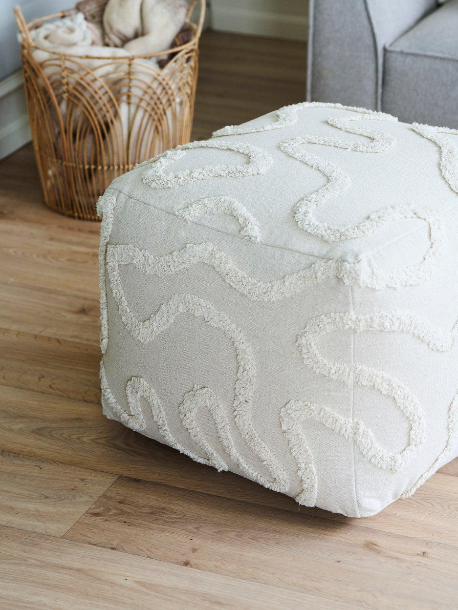 "This pouffe is a charming addition to any living space," Clara says, gently placing it beside the sofa. Anna adds, "It offers cosy seating or a delightful spot to rest one's feet after a long day."