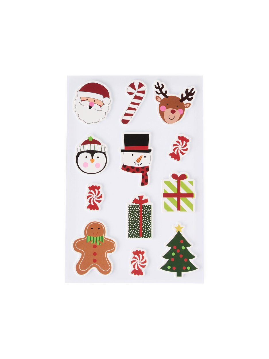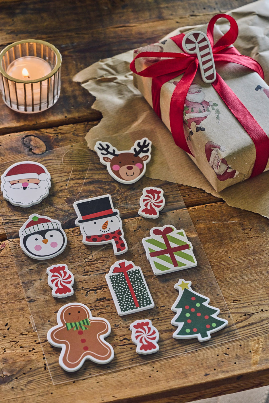 "These festive stickers bring a touch of whimsy to holiday crafts," Clara says, admiring the cheerful designs. Anna smiles, "They add joy to cards and gift wrapping, creating delightful surprises for loved ones."