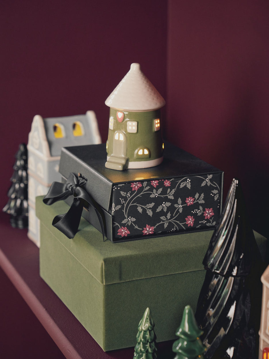 A gift box sits elegantly on the table, its delightful pattern catching the light. "Such a lovely way to present a gift," Clara says as she passes by. "I wonder who the lucky recipient is..."