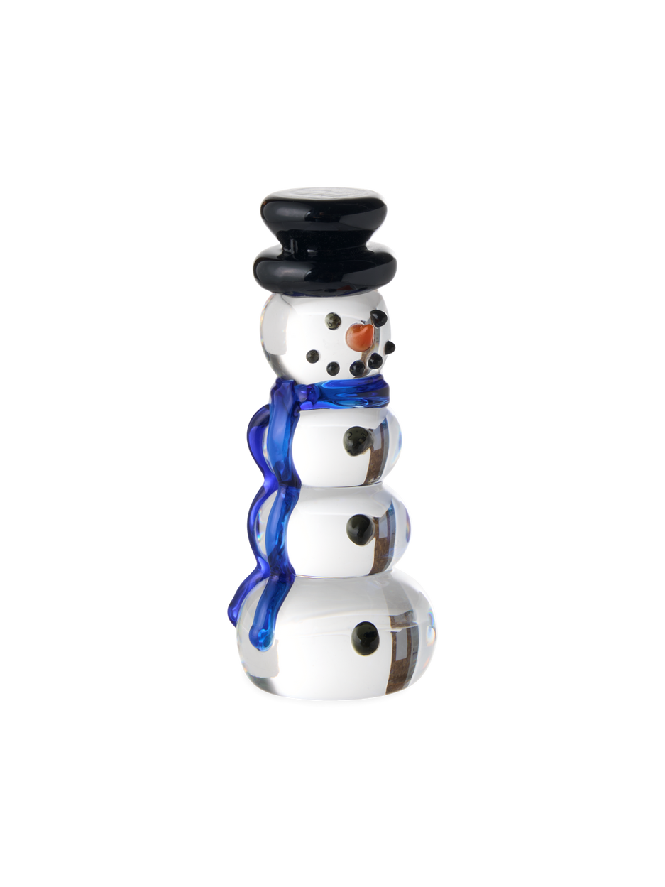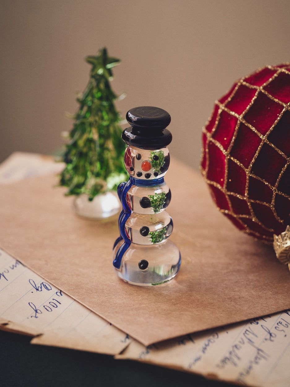 "How delightful this little snowman is," Anna says, placing the glass figurine on the mantel. "It brings a touch of whimsy to our winter décor," Clara adds, appreciating its charm and the way it catches the light.