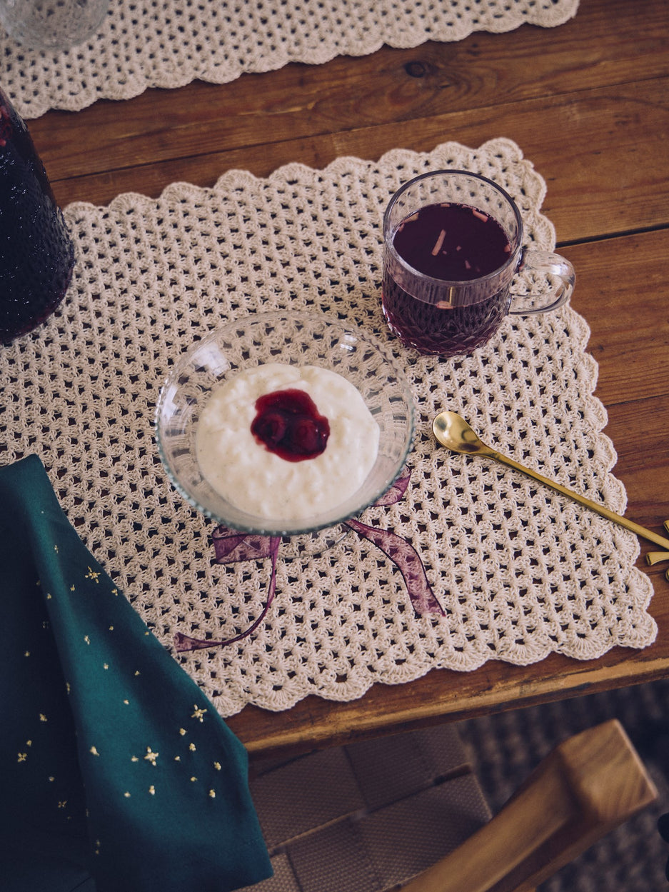 With morning tea, the sisters set the table with a placemat at each place. Clara explains, "It is practical and keeps the surface neat." Anna adds, "Pair with a napkin and a little bloom to bring an aesthetic, cosy mood."