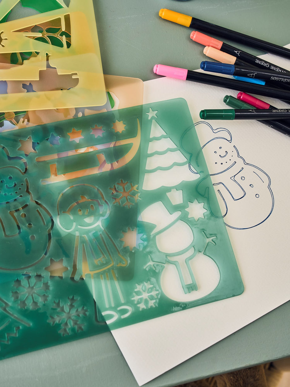 "Creating festive scenes is such a joy with these stencils," Clara notes as she watches the children trace Christmas figures. Anna smiles, "It is a delightful way to inspire creativity and add magic to holiday crafts."