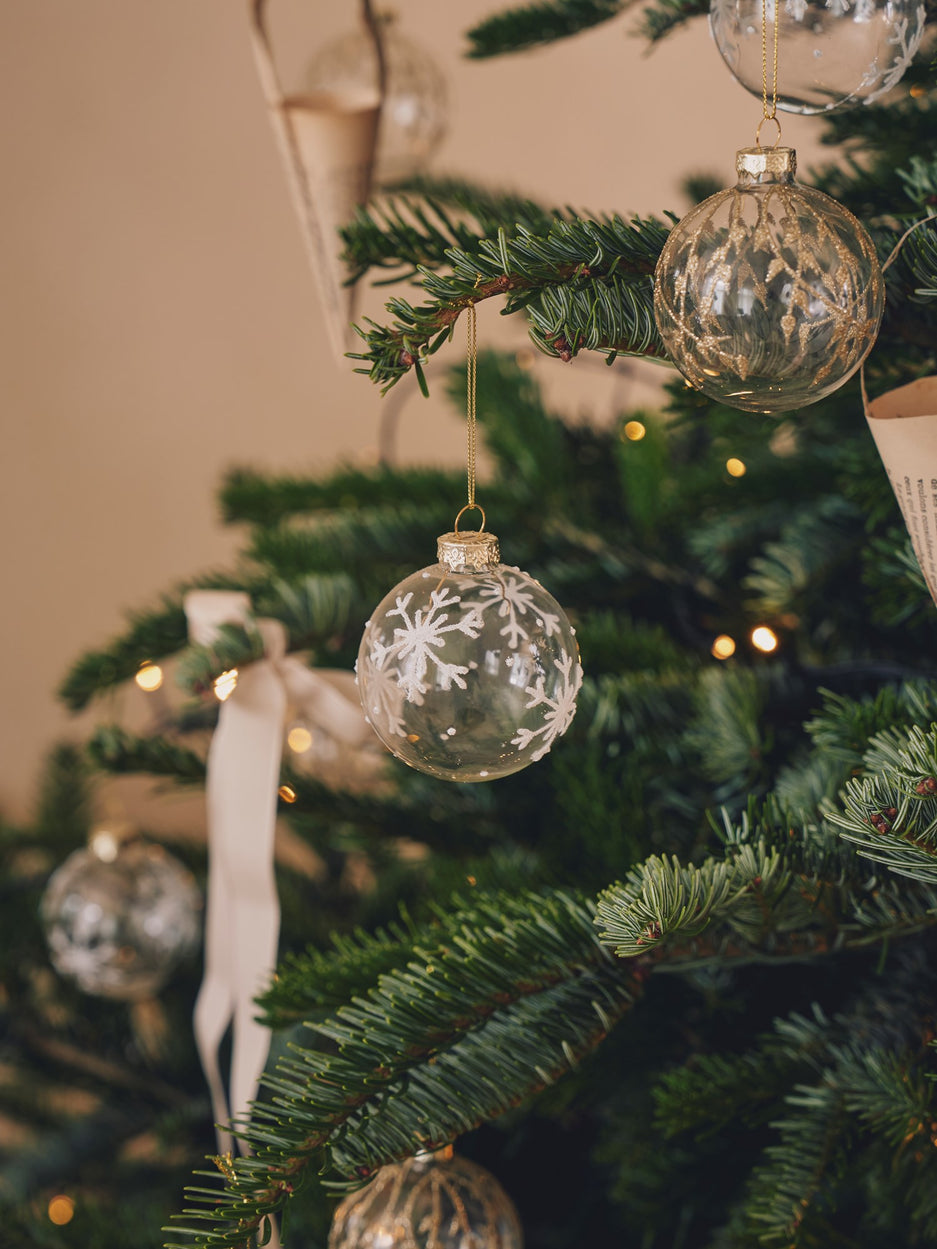 "These baubles bring such joy to the Christmas tree," Clara exclaims, gently hanging one on a branch. "Their shimmering beauty adds a festive charm," Anna continues, admiring the delightful scene they create together.