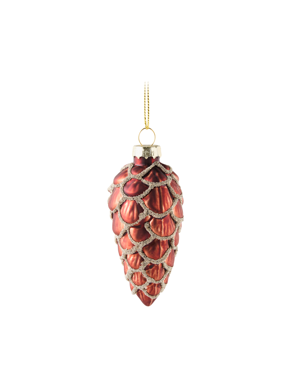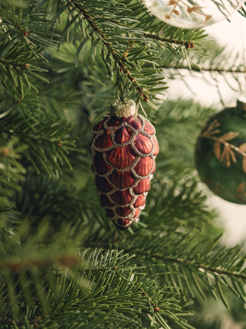 Anna gently hangs the ornament on the tree, saying, "These charming cones bring a touch of nature indoors." Clara adds, "Indeed, they add a lovely texture and warmth to our festive decor."