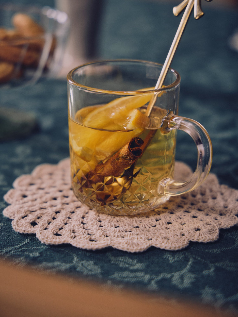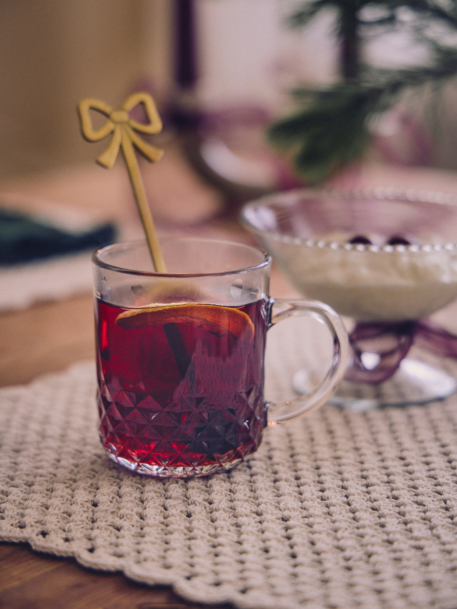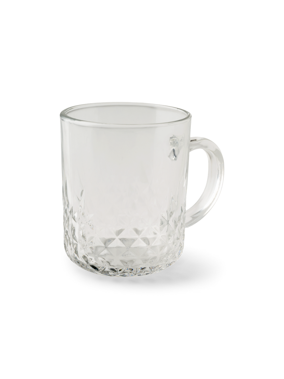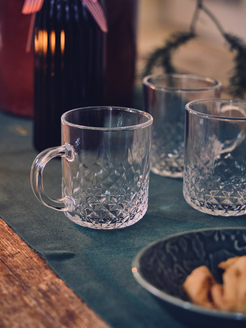 Anna lifts the drinking glass and says, "Its clear sparkle makes the breakfast table feel rather festive."