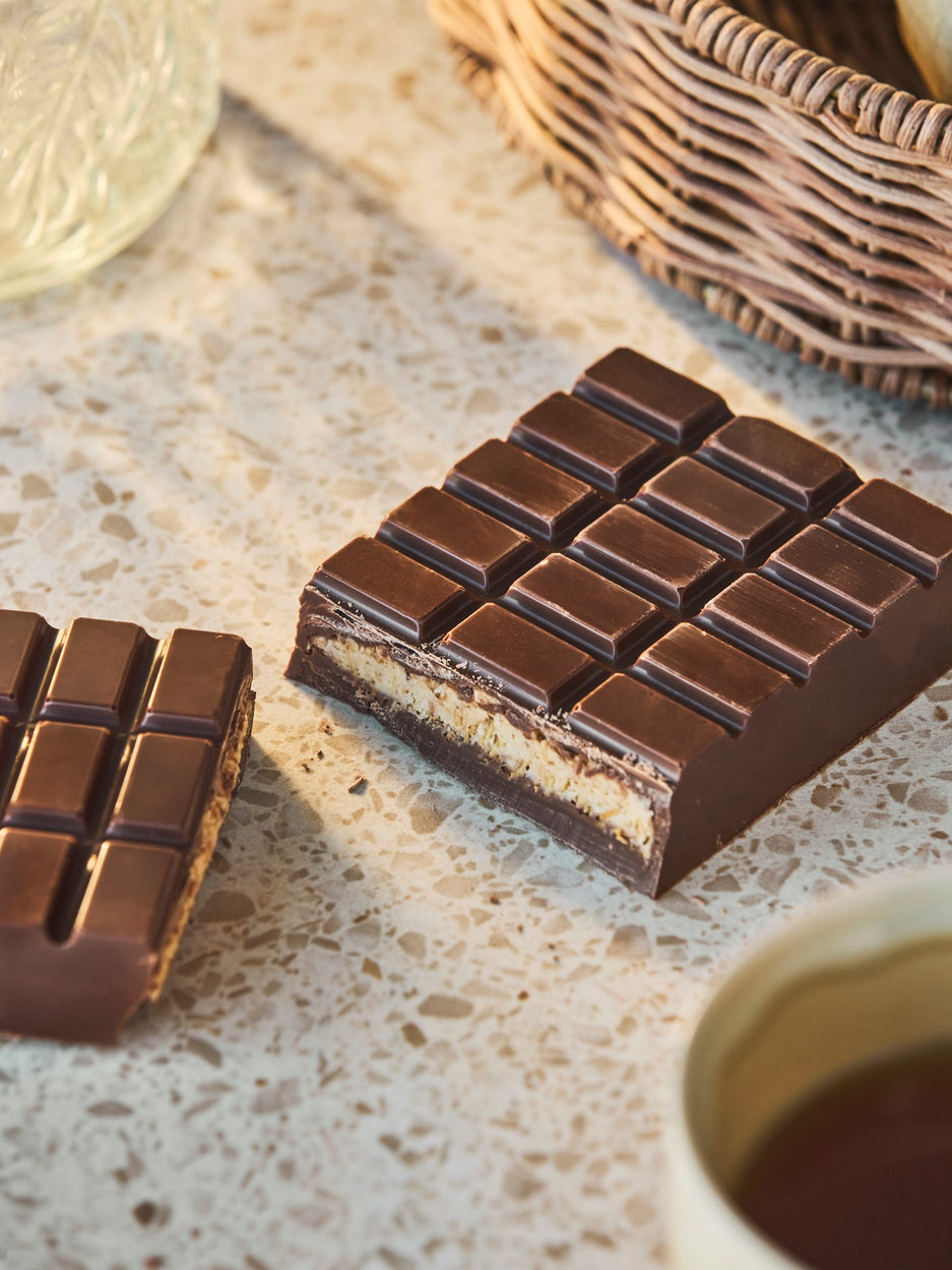 "Such a delightful treat for a cosy afternoon," Clara marvels, holding the hazelnut bar. Anna adds, "A perfect accompaniment to a cup of tea, bringing a touch of sweetness to our day."