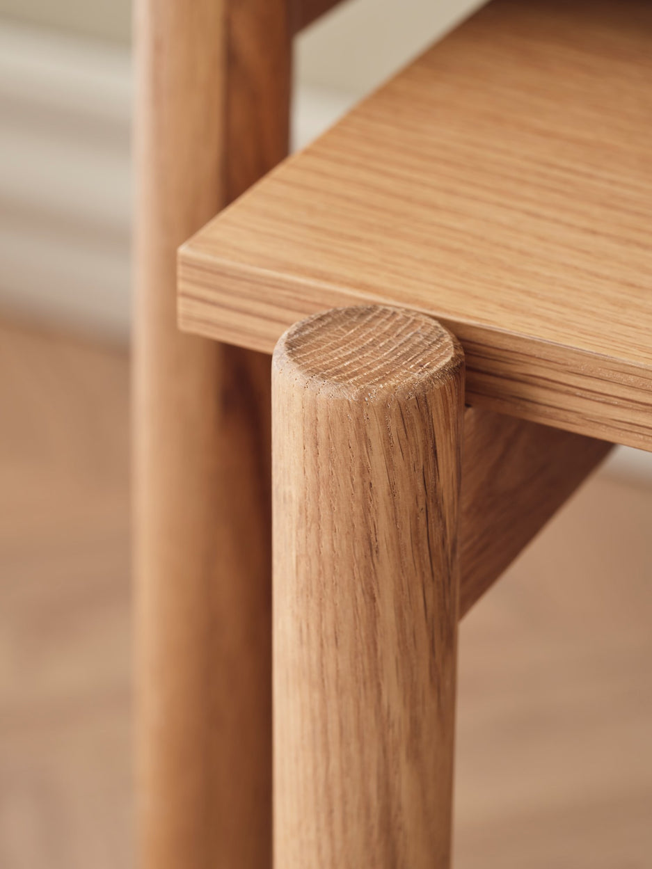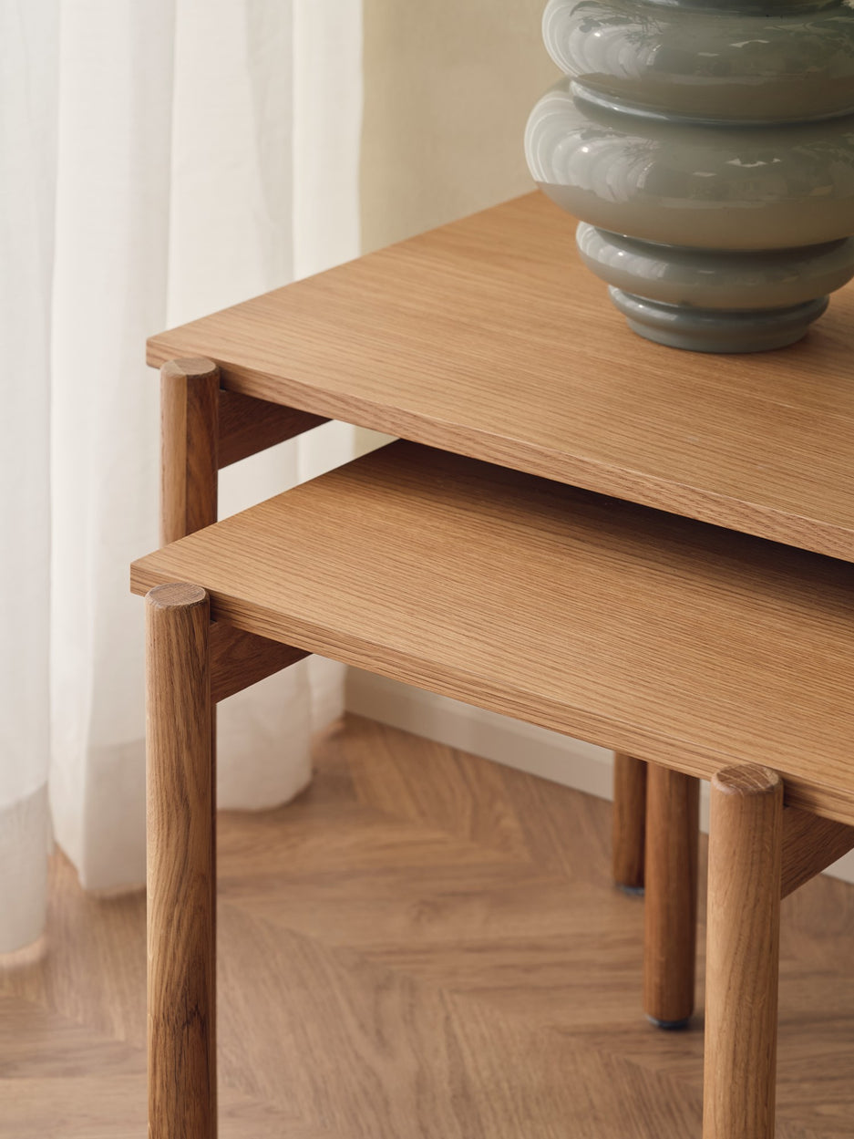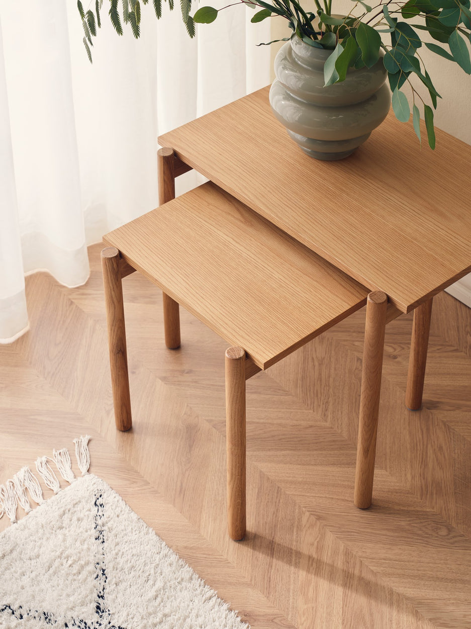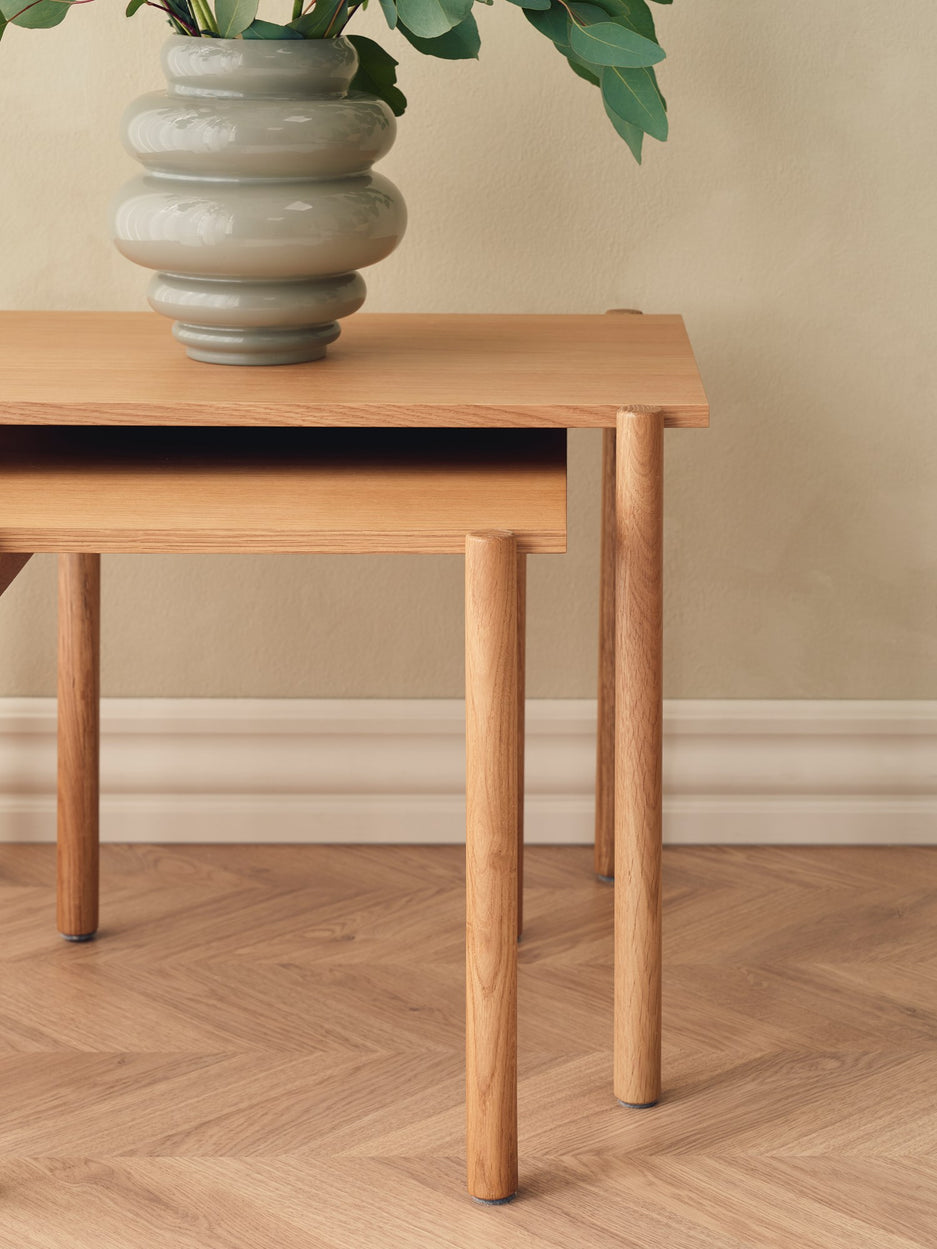Anna arranges a cup of tea and a book upon the side table. "A lovely companion to the sofa and a cosy reading hour," she says. Clara adds, "It keeps essentials within reach and brings gentle order to small corners."