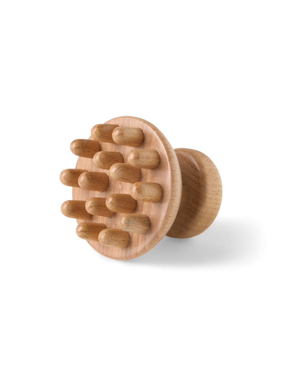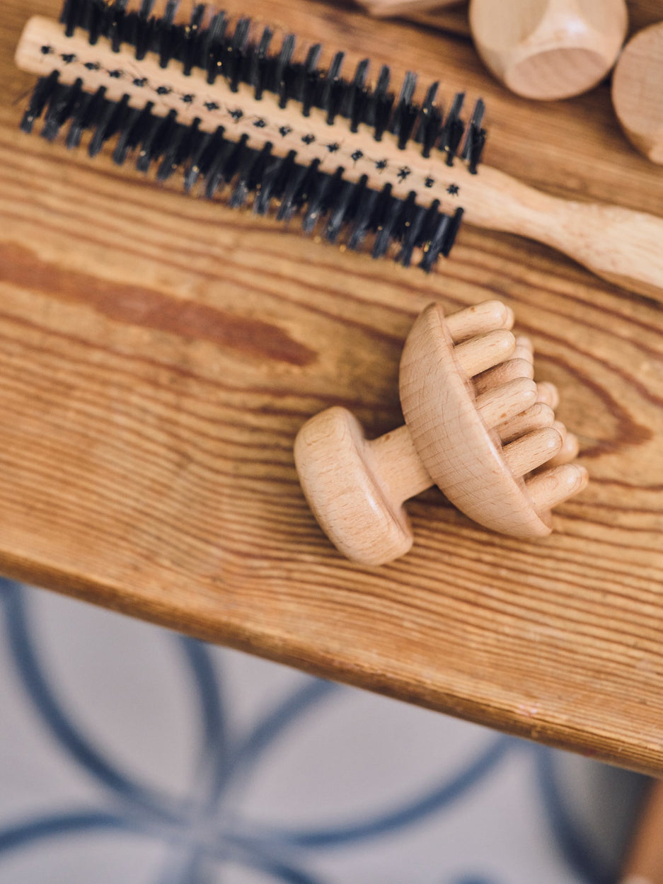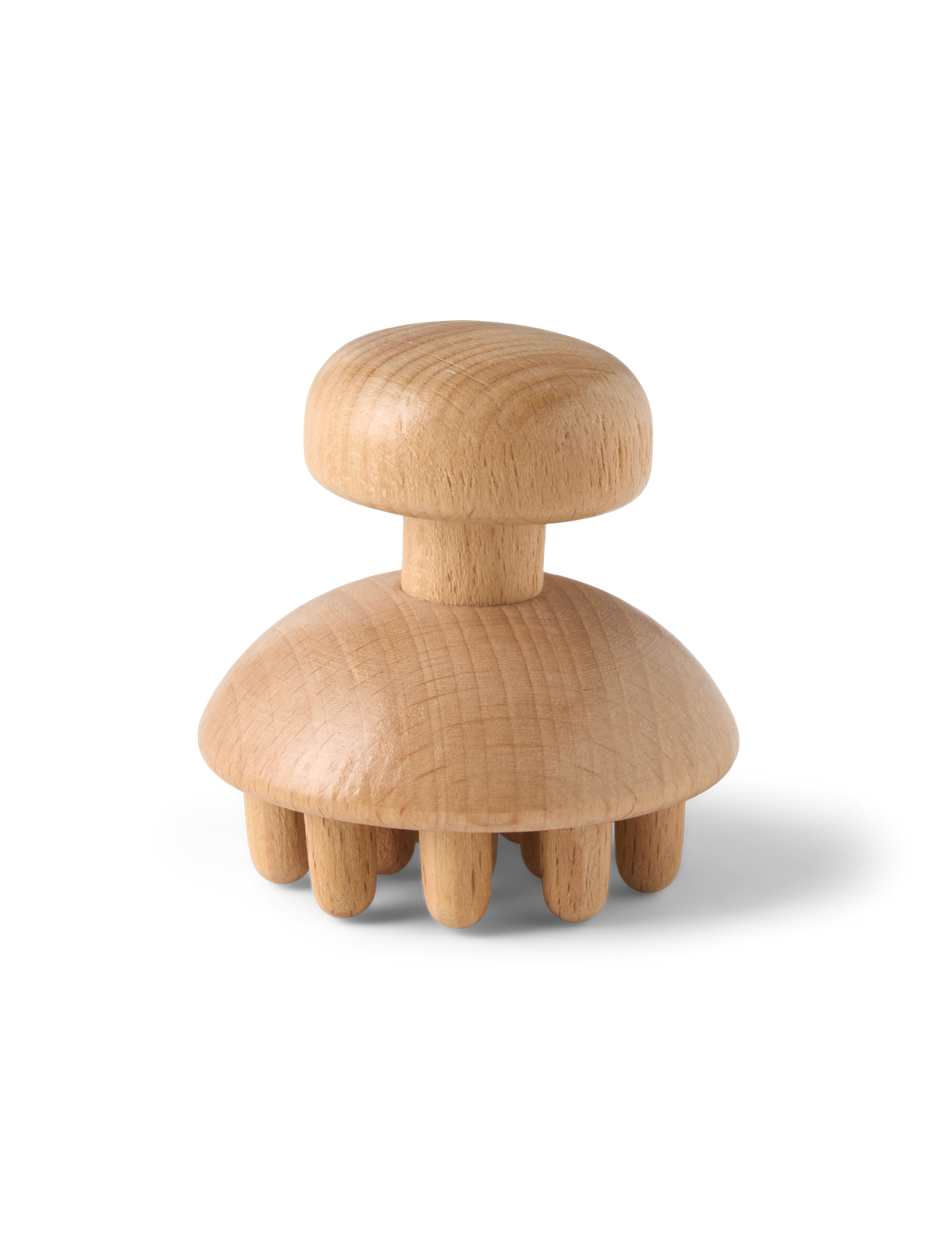 "Such a handy little tool for easing tension," Clara says, rolling the mini wooden massager across her shoulder. Anna adds, "And its design is so charming, it fits right into our skincare routine."