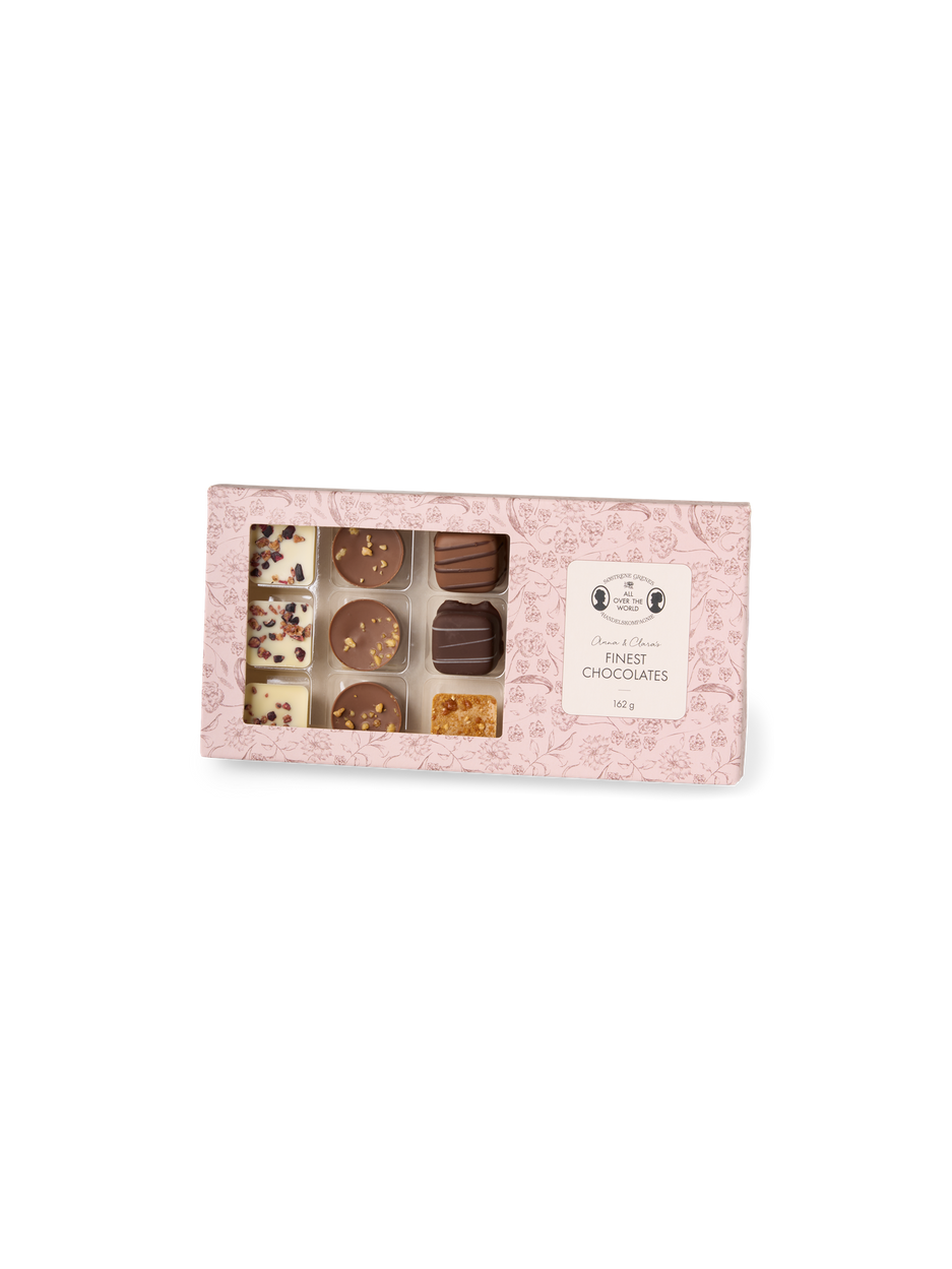Anna carefully selects a chocolate from the delightful gift box, saying, "A charming assortment for any sweet tooth." Clara adds with a smile, "Perfect for sharing during cosy afternoons with loved ones."