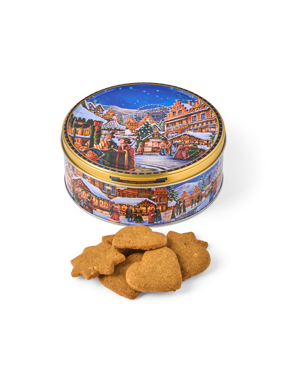 The charming tin of Copenhagen brown cookies brings warmth to any gathering. "A delightful treat for afternoon tea," Clara smiles. Anna adds, "The festive scene makes it a lovely gift for friends and family."