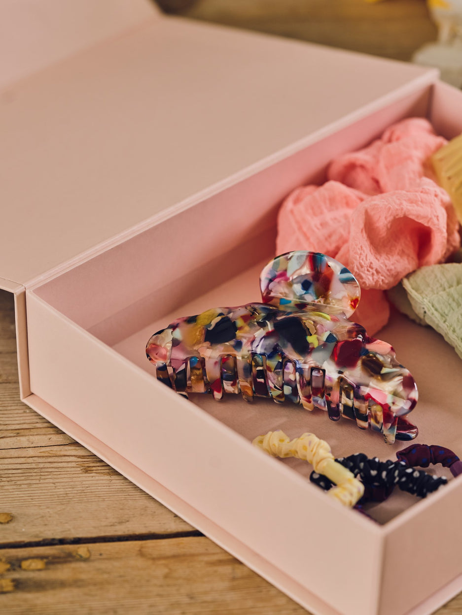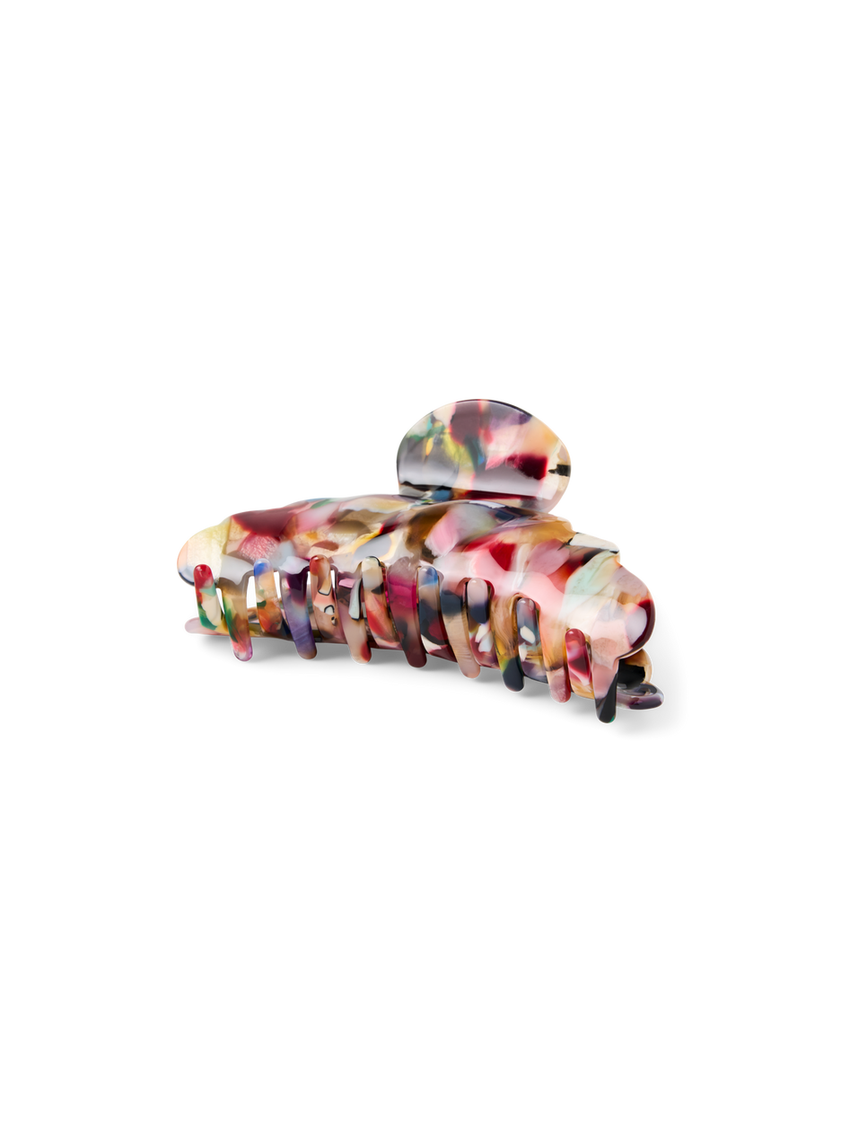 "These multicolour hair claws bring a cheerful touch to any hairstyle," Anna notes, admiring the vibrant patterns. Clara replies, "And they hold hair securely, making them both delightful and dependable."